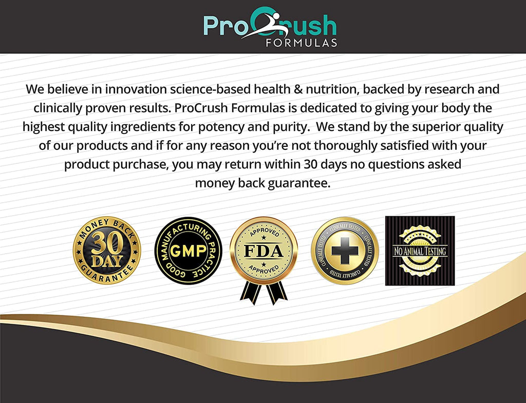 • We believe in innovation science-based health & nutrition, backed by research and clinically proven results. ProCrush Formulas is dedicated to giving your body the highest quality ingredients for potency and purity. We stand by the superior quality of our products and if for any reason you’re not thoroughly satisfied with your product purchase, you may return within 30 days no questions asked money back guarantee. Manufactured in the USA in a registered FDA facility.